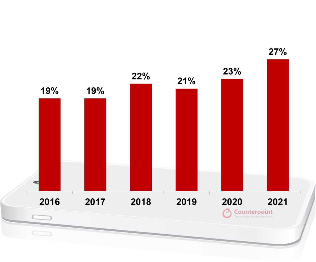 根据Counterpoint数据,2021年全球400美元(约合人民币2541元)以上智能手机的销量占比已经增长至27%,在短短一年内就增加了4个百分百点。