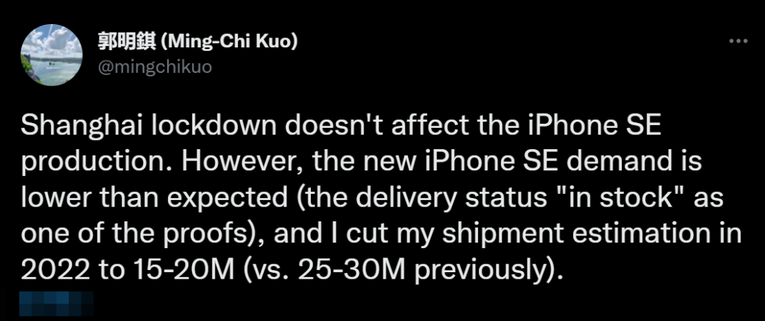 不仅是国内市场,海外巨头苹果这边情况也不乐观,苹果分析师郭明錤对于新发布的iPhone SE三代出货量预测从2500-3000万部降至1500-2000万部,预测降幅最高约40%。