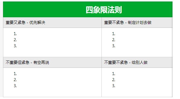 更进一步,深入到文件和工作内容上便是任务管理。任务管理的方式因人而异,既可以借助各类软件,也可以简单的写便签贴满工位,不必拘泥于方法种类。例如我自己并没有研究各种工具,而是简单得建立一个 Excel 的待办表单,每天早晚打开进行识别任务和更新进度。但重要是要清晰地辨别自己的工作内容哪些是重要的,哪些是紧急的,哪些是战略思考性的,哪些是边边角角不急于一时的。这里总体规划策略上我推荐使用史蒂芬·柯维(Stephen Covey)在《高效人士的七个习惯》里给出的四个分类: