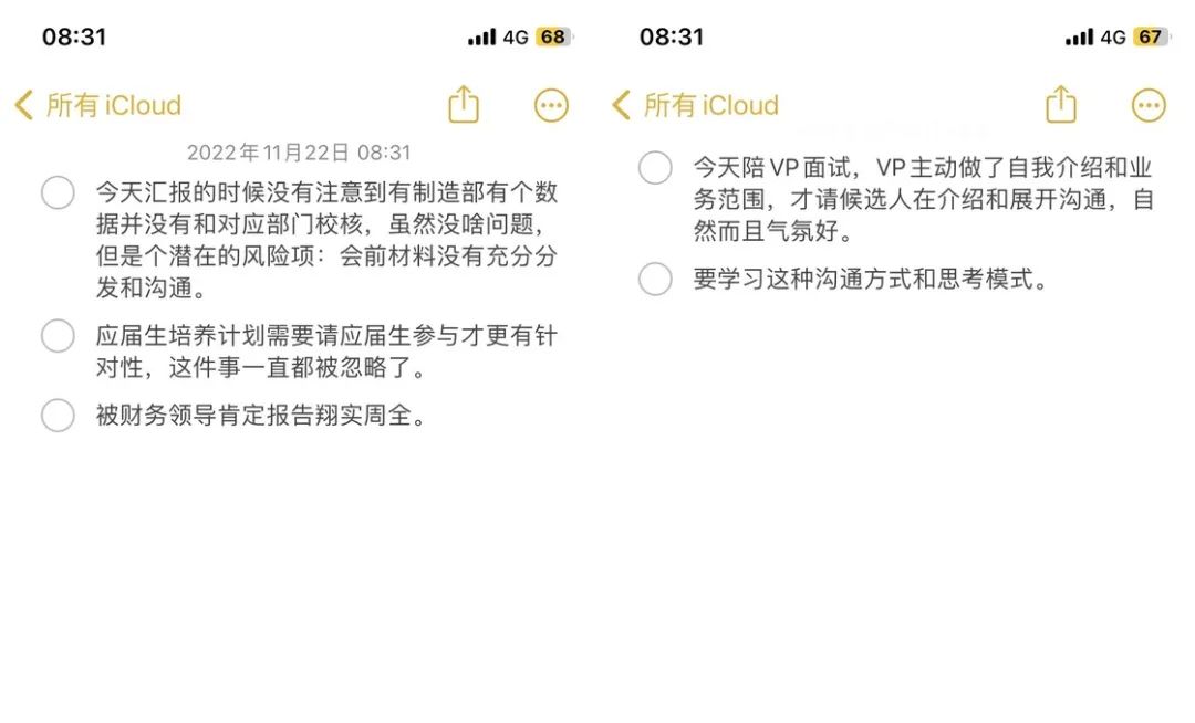之后我便逐渐建立了自我复盘之旅:每天在下班路上思考当日工作要事自己的行为是否有出色或不妥之处,如果涉及如何改进就会形成工作笔记定期复看。每周设定特定半小时复盘当周工作关键进度和工作笔记,逐步形成了良性思考和闭环改进路径。我自己的常用三个问题如下作为参考:今天的工作有没有值得延深思考的事项?其他人哪个行为让你觉得值得思考或避免?自己做了哪些不错的动作值得坚持?