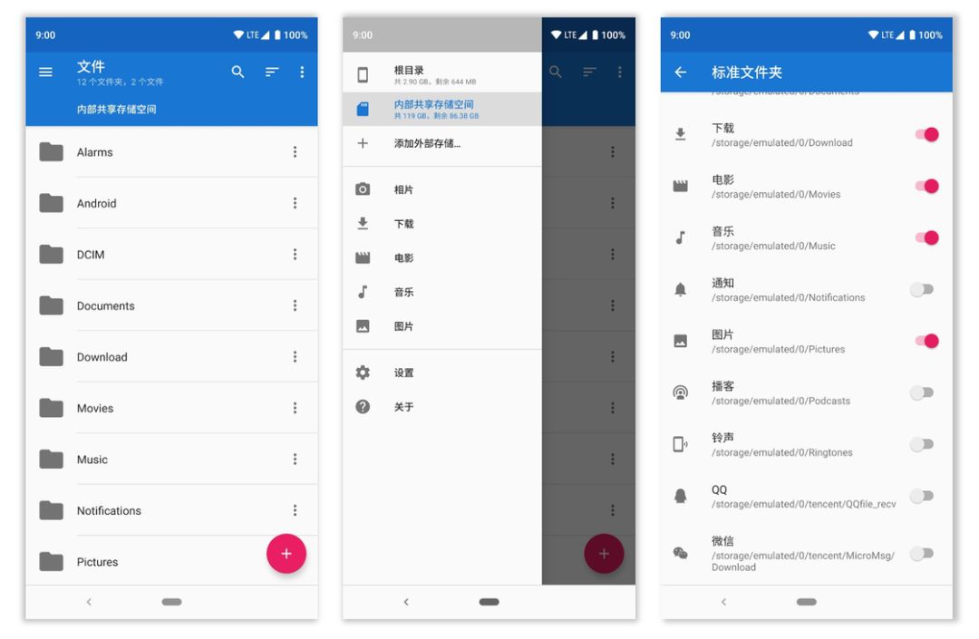 最后,目前看来质感文件最大的亮点在于侧栏中的「标准文件夹」分区——我们不妨将该区域看作是用于快速跳转的路径书签,点击即可进入相应的文件目录,而质感文件在设置中不仅提供了下载、文档、照片、电影、音乐等常用标准文件夹目录开关,还特别针对国内用户可能会常常用到的 QQ 和微信目录进行了定制,如果你的手机上安装了 QQ 和微信,开启后就能直接在侧栏中一键跳转至对应的文件存储目录。