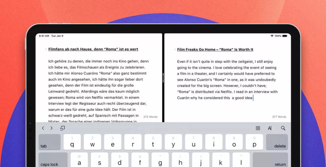 不过本次 V16 更受人关注的更新还是 iPad 上的分屏模式。Ulysses for iPad 可以在新版本中同时打开两个编辑器,所以你可以同时编辑两个文档。与此同时,你也可以利用分屏模式来实现所见即所得的预览效果,将其中一个窗口设为预览模式,即可实时预览另一个窗口中编辑器的内容,对于注重排版效果的人来说非常有帮助。