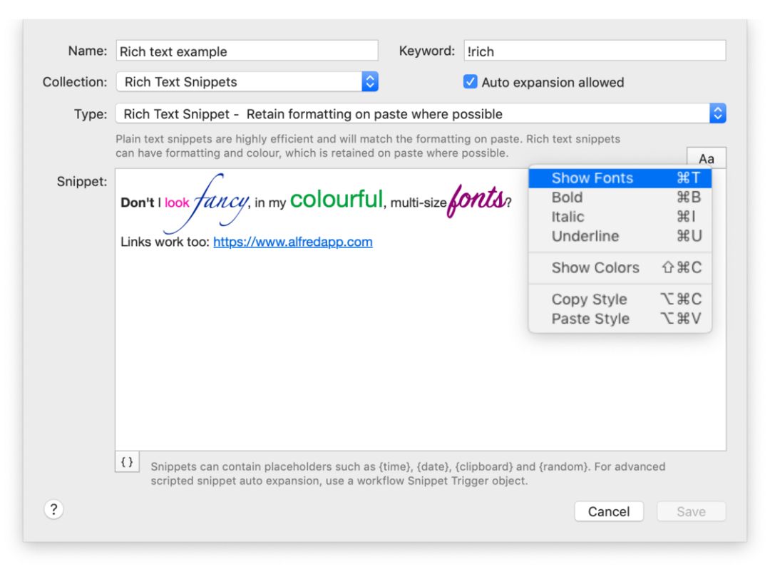 短语快速输入功能 Snippets 加入对富文本的支持,并且配有简单的富文本编辑菜单,包含字体、粗体/斜体/下划线、颜色等。内置的占位符功能添加随机值选项,并且新增了修饰符语法。