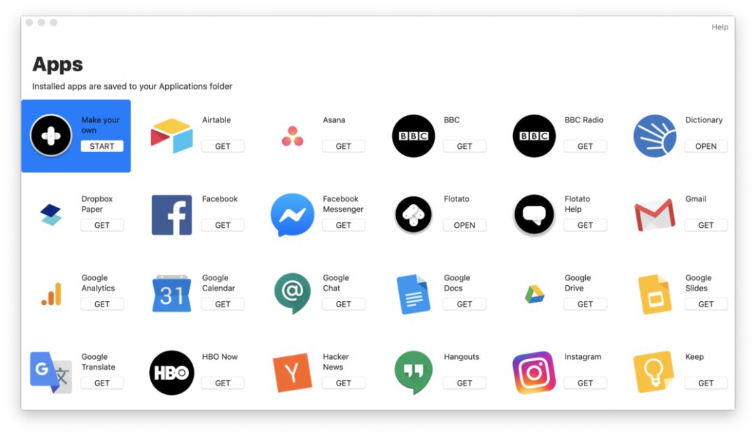 Flotato 来自 Rotato (原 Design Camera) 的开发者,应用内置了 Notion、Trello、Netflix 等热门的应用生成方式,一键就可以帮你做一个本地的 macOS 应用。如果 Flotato 的应用库里没有你在用的 App,跟其它类似工具一样,你可以通过输入相应网站的 URL,自己做一个应用出来。