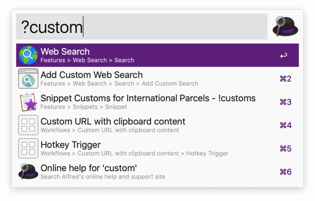 Alfred 输入框中搜索?关键词,可以直达 Alfred 偏好设置中的各种功能。构成 Workflow 的每个对象、Snippets 中的每条片段,以及网络搜索配置,都可以通过搜索准确定位,进行修改。此外,在 Alfred 中搜索「?hotkey」、「?keyword」会列出包含内置功能与 Workflow 在内的所有快捷键与动作关键词,不必再为记不住而烦恼。
