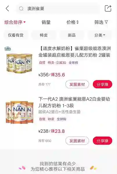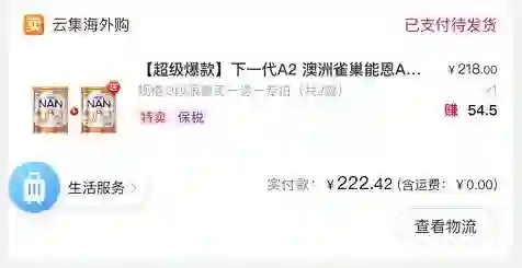 她展示的一张订单截图线上,一件雀巢能恩奶粉售价218元,自己可以赚到54.5,也就是25%的收益。而目前,这款奶粉在活动结束后,售价涨到了238元,店主分享的收益则降到了23.8。
