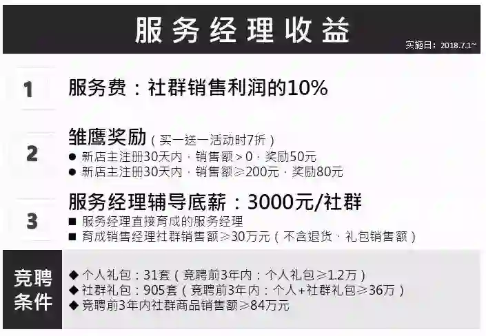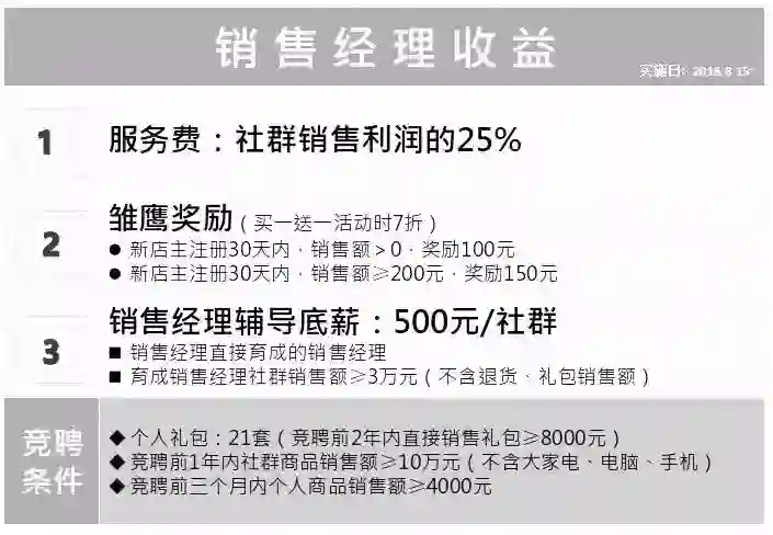 创业邦拿到的一份资料显示,销售经理能拿到的服务费为社群销售利润的25%,竞聘条件为两年内直接邀请21人,一年内社群销售额超过10万且不含高单价商品,三个月内个人直接销售额超过4000元。服务经理的竞聘条件则是三年内个人直接邀请31人,直接邀请加间接邀请总和超过905人。