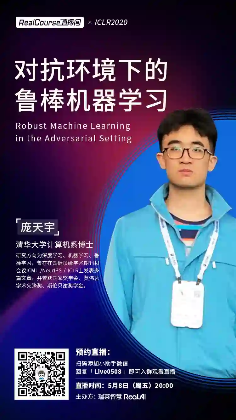 北京时间 5 月 8 日(周五)20:00,我们邀请到清华大学计算机系博士庞天宇做客首期「RealCourse 直播间」!届时,他将为大家带来“对抗环境下的鲁棒机器学习”的主题分享。