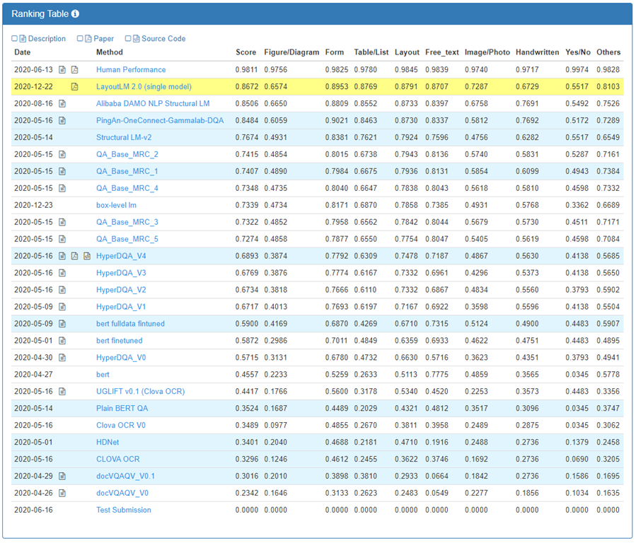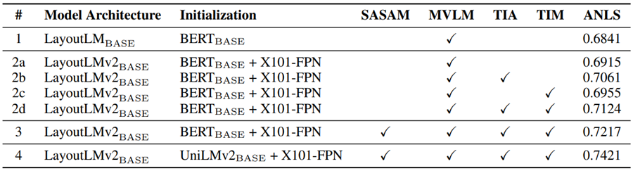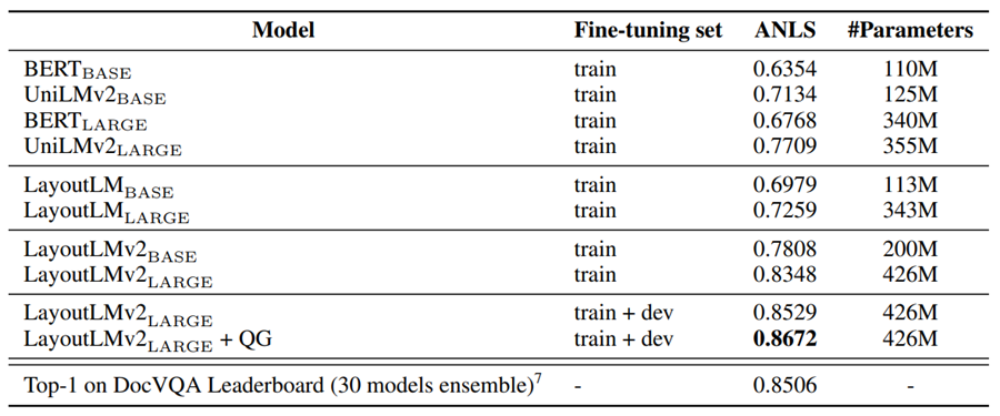 表6:LayoutLM 2.0 在视觉问答数据集 DocVQA 上的实验结果