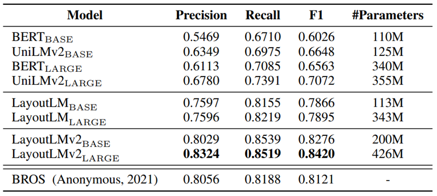 表2:LayoutLM 2.0 在票据理解数据集 CORD 上的实验结果