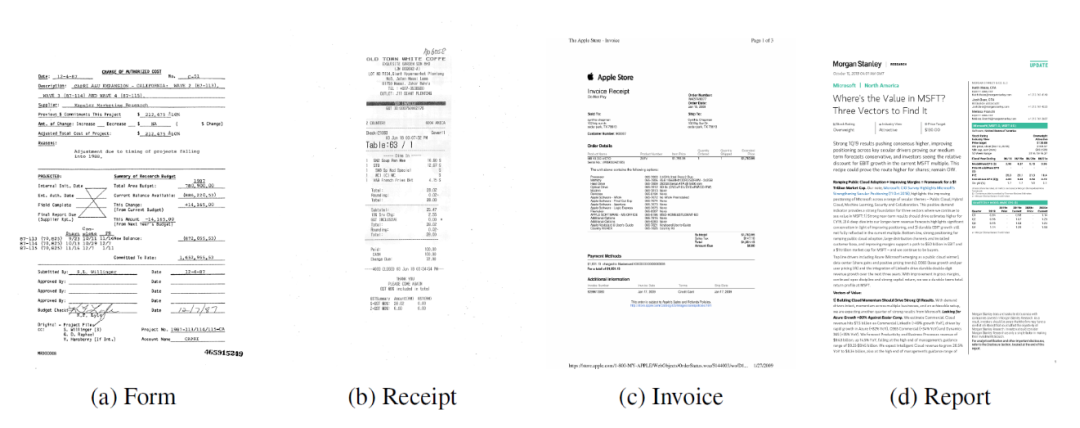 文档智能是一种旨在针对扫描文件或数字商业文档(图像、PDF 文件等)进行理解并分析,同时将其中的非结构化信息进行抽取和结构化的技术。与传统的信息抽取技术不同,文档智能技术不仅仅依赖于商业文档中的文本信息,同时还会考虑更多的富文本图像和布局位置等信息对文档进行分析。例如,图1中包含了多种文档类型(包括表单、收据、发票、商业报告),不同的文档类型反应了人们所关心的信息会出现在不同的视觉位置上,而这些视觉位置经常由文档模板的类型和风格所决定。因此,如果希望能够从不同类型的文档中精确地分析和抽取出感兴趣的重要内容,仅仅考虑纯文本信息是远远不够的,而是需要利用不同模态之间的关联,通过文本、图像、布局位置信息的联合建模来进行智能文档理解。