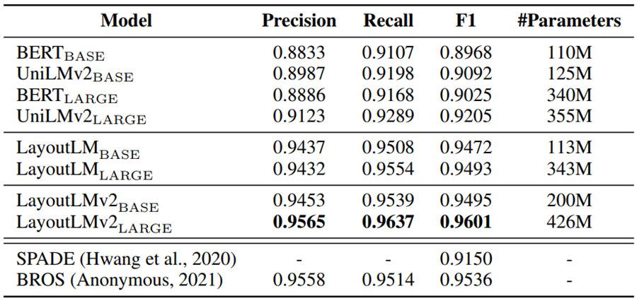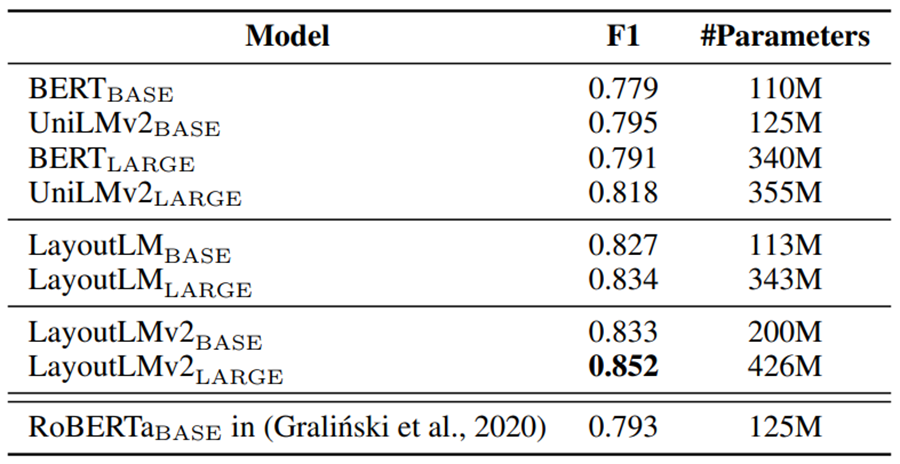 表1:LayoutLM 2.0 在表单理解数据集 FUNSD 上的实验结果