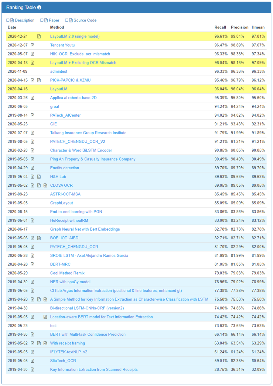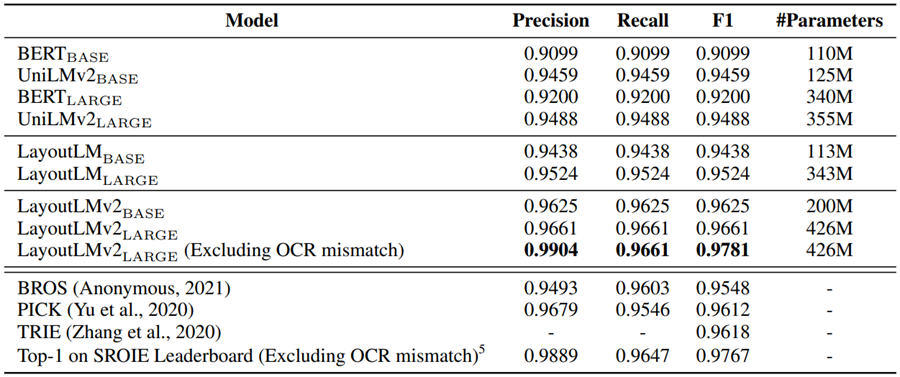 表3:LayoutLM 2.0 在票据理解数据集 SROIE 上的实验结果