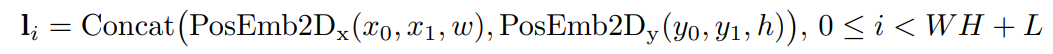 对应于每个词或图像区域在页面中覆盖的坐标范围,使用平行于坐标轴的边界框(bounding box)表示布局信息。LayoutLM 2.0 沿用了1.0的处理方式,用4个边界坐标值、宽、高来表示一个边界框。最终的布局向量由6个特征对应的向量拼接得到: