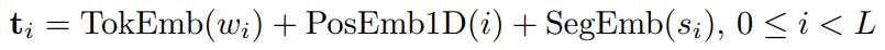 再将词向量、一维位置向量、分段向量(代表 [A] 或 [B])相加得到文本向量,算法公式如下: