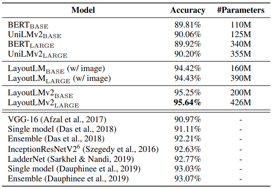 表5:LayoutLM 2.0 在文档图像分类数据集 RVL-CDIP 上的实验结果