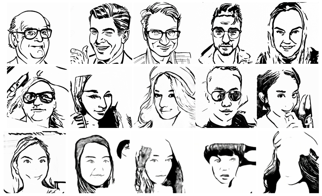 肖像线条画是一种高度抽象、具有表现力的艺术形式,将人物肖像中的丰富信息进行高度压缩,仅用稀疏的图形元素(如线条)表示。精致的肖像线条画需要艺术家精心绘制,十分耗费时间。一些现有方法使用成对训练数据生成肖像画,但是收集数据的过程是昂贵且耗时的。