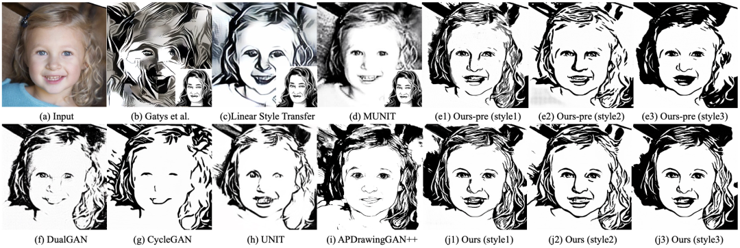 (a)输入人脸照片;(b-c)风格迁移方法:Gatys和线性风格转换方法;(f)单模态的图像到图像的转换方法:DualGAN,CycleGAN,UNIT;(d)多模态的图像到图像的转换方法MUNIT;(e)论文的方法去除质量损失,输出的三种风格;(i)使用成对训练数据的肖像生成方法APDrawingGAN++方法;(j)论文方法生成的三种风格。