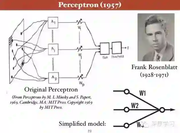康内尔大学教授 Frank Rosenblatt 1957年 提出的“感知器” (Perceptron),是第一个用算法来精确定义神经网络,第一个具有自组织自学习能力的数学模型,是日后许多新的神经网络模型的始祖。