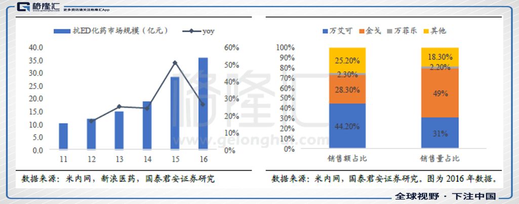 随着仿制药带动价格下移使消费者教育加速推广,金戈作为首仿药有望继续扩大市场份额,实现快速增长: