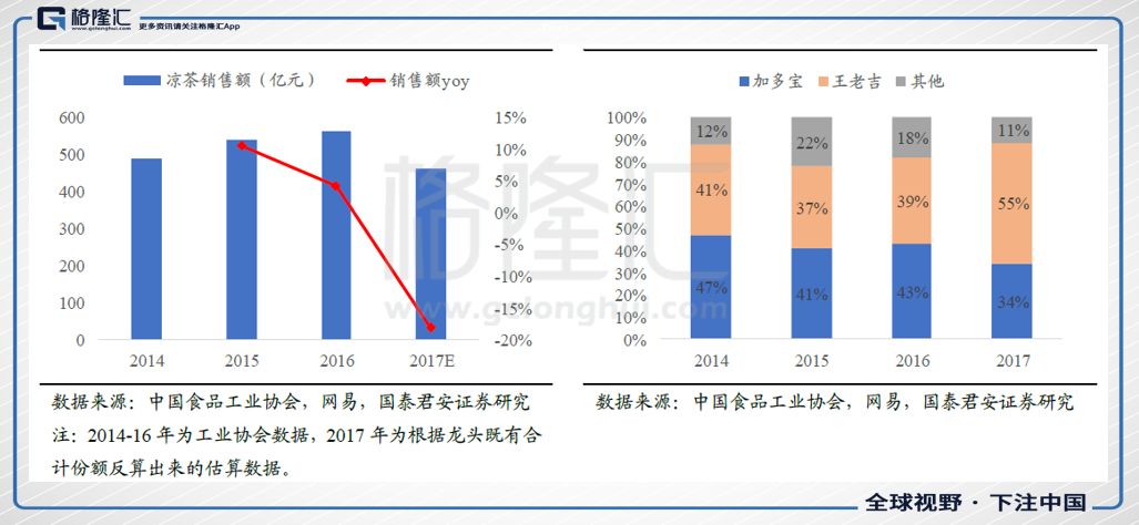 图八:2017年凉茶市场因龙头下滑而降幅较大 图九:王老吉市场份额日渐扩大