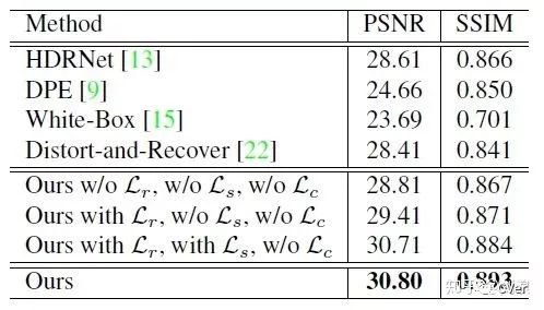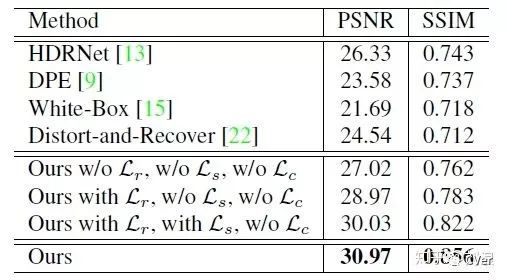 使用了两个常用的度量标准(即,PSNR和SSIM)来定量评估我们的网络性能,根据预测结果和相应的专家润色图像之间的颜色和结构相似性。虽然这不是绝对的指示性,但总的来说,高的PSNR和SSIM值对应着相当好的结果。