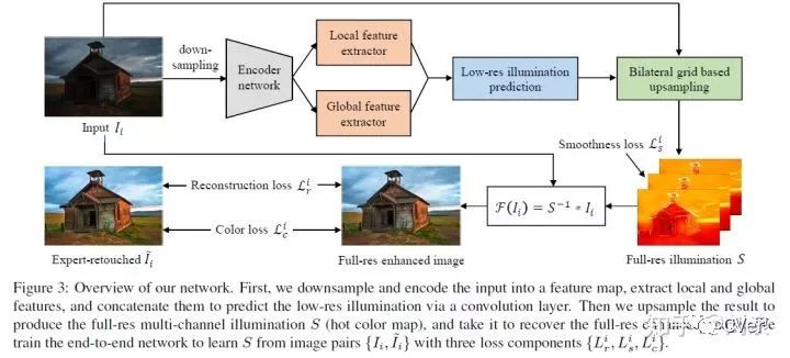 。编码器网络是一个预先训练的VGG16。局部特征提取器包含两个卷积层,全局特征提取器包含两个卷积层和三个全连通层。此外,使用基于双边网格(bilateral grid)的模块对输出进行向上采样。