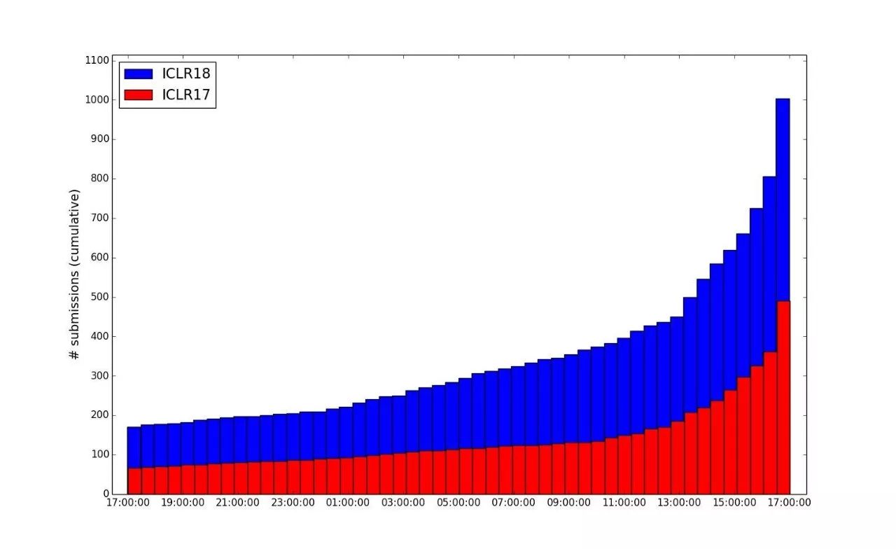 ICLR 2018的论文投递于10月27日截止。论文的提交情况充分表明学者们本着精益求精的精神直到最后时刻还在修改完善论文。在最后一天(截止时刻前24小时),论文提交量由不足200篇暴增至1003篇,其中有200多篇论文是最后半小时提交的。