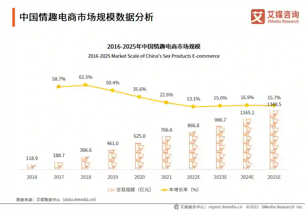 艾媒咨询上述报告显示,2016年以来,中国情趣电商市场交易规模保持增长态势。数据显示,2016年,中国情趣电商市场规模只有118.9亿元,到2021年,已经增长到766.6亿元,预计2022年达到866.8亿元,六年增长超七倍。