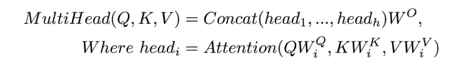 多头机制是指,引入多组的参数矩阵来分别对Q、K、V进行线性变换求self-attention的结果,然后将所有的结果拼接起来作为最后的self-attention输出。这样描述可能不太好理解,一看公式和示意图就会明白了,如下:
