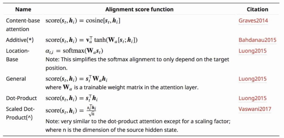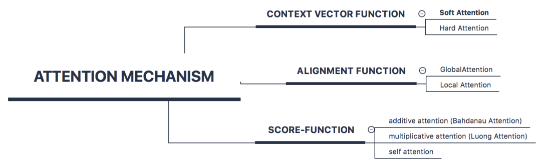 Attention的类型通常围绕score function 、alignment function 、context vector function,这三者之间的变化展开: