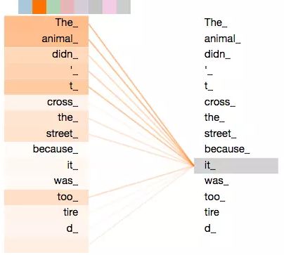 在图8中我们展示了可视化后的Self-Attention机制,Self-Attention可以捕获同一个句子中单词之间的一些句法特征或者语义特征。上图展示了Self-Attention捕获了同一个句子中单词之间的语义特征,“it”的指代对象是“the animal”。
