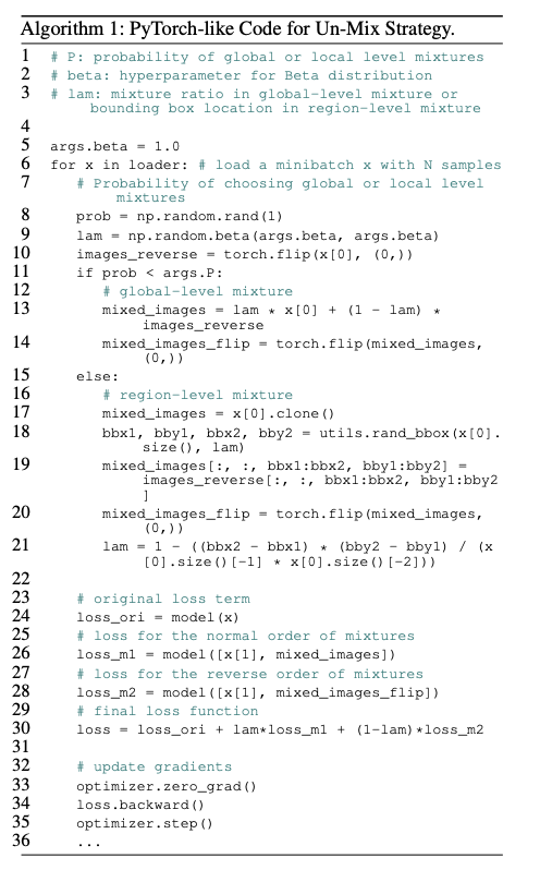 具体地,作者将一个批量(mini-batch)中的样本做一个倒序,然后跟原来的样本们做加权融合,两张原图的距离分别变成为λ和1-λ