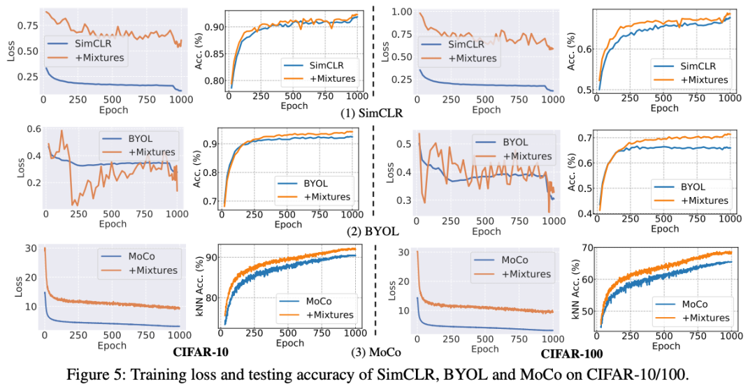 可以发现一个比较有趣的现象:在加入了 Un-Mix 之后,训练的损失值(training loss)变得非常不稳定,波动很大,这是因为在输入空间进行图像融合操作之后导致两个分支的距离度量变得更加细微多样和敏感。但是这对模型泛化能力是有帮助的,在做模型测试的时候依然可以取得更好的测试性能。