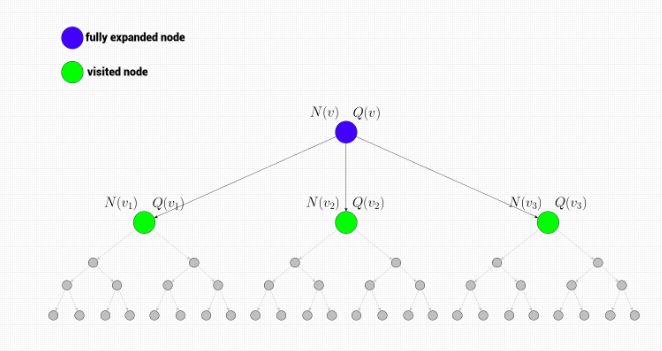 在搜索的一开始,由于我们还没有开始任何模拟,所以首先选择未访问的节点。单个模拟从根节点开始遍历到叶节点,结果又反向传播到根节点,然后根节点被认为完全展开。