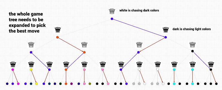 给定一个根节点加上游戏规则,我们可以遍历它,而不需要将整个树存储在内存中。在最初的形式中,它根本没有扩展并且处于游戏树的根部,其余节点未被访问。一旦我们考虑到一个动作,就会想象这个动作会产生什么样的结果。