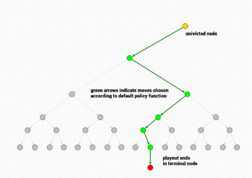 我们首先关注模拟,因为它不会严重依赖其他术语的定义。模拟是一种单一的游戏行为,是一系列从当前节点开始,并终止于可计算游戏结果的终端节点的动作序列。模拟是通过在该节点处开始以某种方式随机游戏来计算的游戏树节点评估近似值。在模拟过程中如何选择动作?在模拟过程中,选择一个称为“转出策略”的函数: