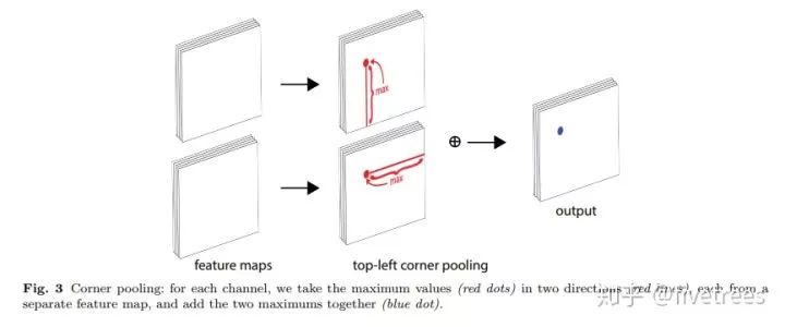 对于右下角点的 Corner pooling 操作类似,只不过找最大值变成从 (i,j) 到 (0,j) 和从 (i,j) 到 (i,0) 中找。比如 Figure6 中,第一张特征图,比如第 2 行的第 1 个点(值为2),其右边同一行的最大值是 3 ,故经过 Corener Pooling 后,其值变为3,其他同理;第 2 张特征图,第 2 列的第一个点为 3,其下面所在列的最大值(包括本身)也是 3,因此经过 Corener pooling 之后,其中也变为 3,最后将 2 张特征图对应位置的点的特征值相加,得到一张特征图。