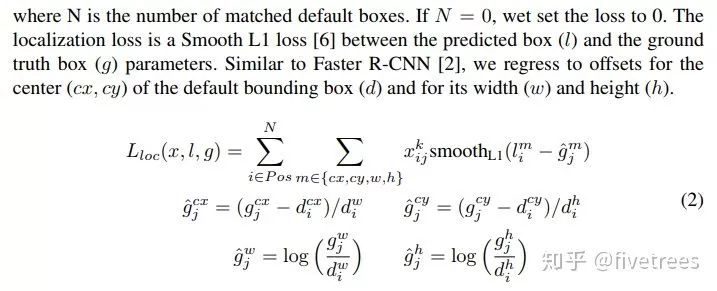 回归策略基本和 Faster R-CNN 中一致,对边界框的回归的损失函数也是采样的 Smooth L1 损失函数,不过这里的先验框名字叫 Default Box 和 Faster R-CNN 中的 Anchor 叫法不一样。