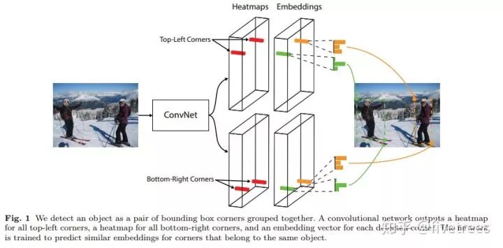 负责检测哪个 top-left corner 和哪个 bottom-right corner 是一对,组成一个 box,同一个 box 的 corner 距离短。top-left 和 bottom-right corner 各预测一个 embedding vector,距离小的 corner 构成一个 box