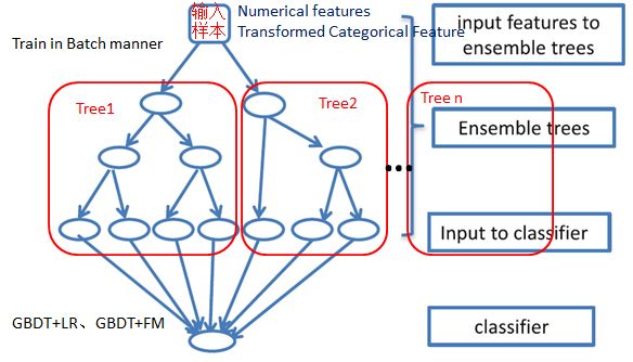 一般做法是将样本的连续值特征输入ensemble tree,分别在每颗决策树沿着特定分支路径最终落入某个叶子结点得到其编号,本质上是这些特征在特定取值区间内的组合。ensemble tree可以采用Gbdt 或者 random forest实现。每一轮迭代,产生一棵新树,最终通过one-hotencoding转化为binary vector,如下图所示。