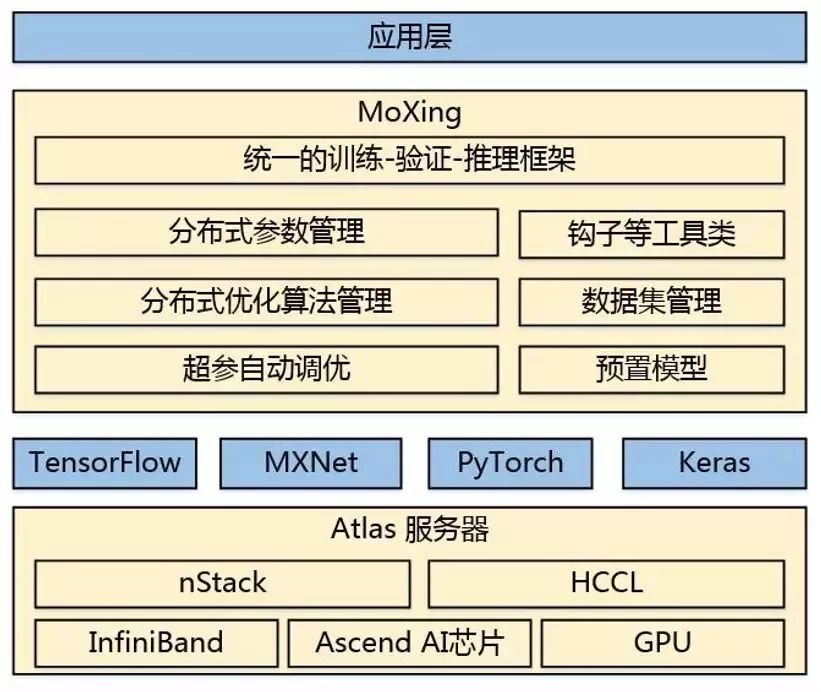 在模型训练部分,ModelArts 通过硬件、软件和算法协同优化来实现训练加速。尤其在深度学习模型训练方面,华为 将分布式加速层抽象出来,形成一套通用框架——MoXing(“模型”的拼音,意味着一切优化都围绕模型展开)。