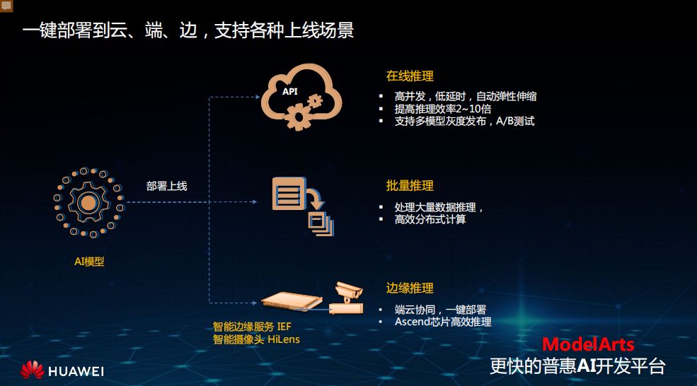 对于此类场景,ModelArts 可以一键推送模型到所有边缘、端的设备上,云上的部署还支持在线和批量推理,满足大并发和分布式等多种场景需求。