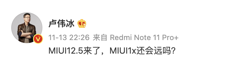 Redmi 品牌总经理卢伟冰在微博上暗示 MIUI 13 很快到来——“MIUI 12.5 来了,MIUI 1x 还会远吗?”。