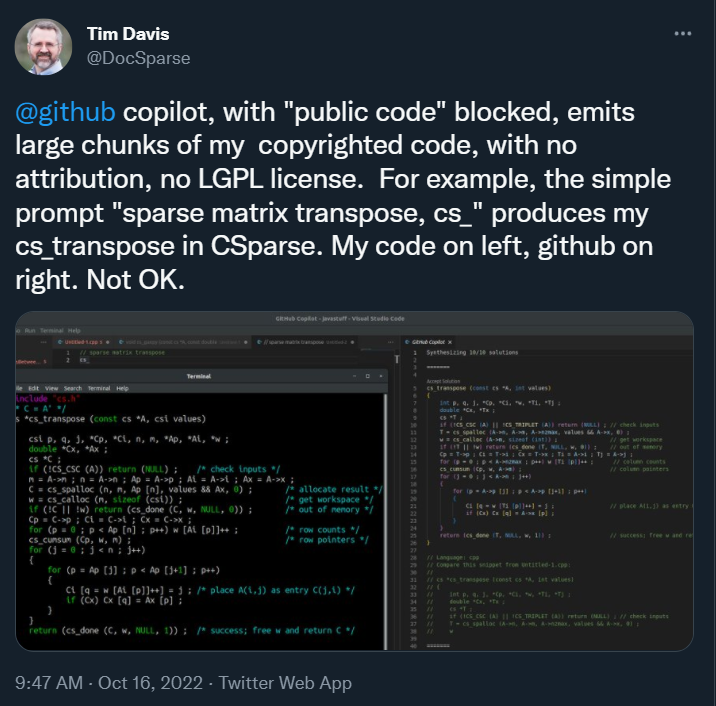 这些建议的代码会有什么问题?已经有 Copilot 用户指出,Copilot 可能会被诱导从可识别的 repo 中一字不差地复制代码。前段时间,得克萨斯农工大学教授 Tim Davis 给出了很多例子来说明 Copilot 确实逐字复制了他的代码。
