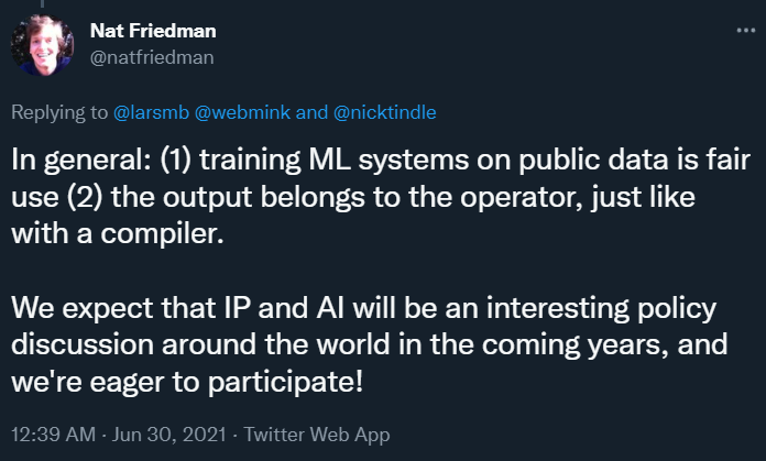因此,微软和 OpenAI 必须找到一个「合理使用( fair-use )」的理由。GitHub 前 CEO Nat Friedman 在 Copilot 的技术预览会上曾经说过,「在公开数据上训练(机器学习)系统属于合理使用。」