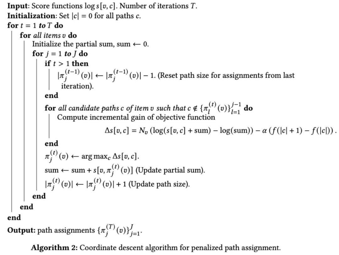 下面来介绍重头戏,就是一个 item 如何确定去哪几个 path,这个跟网络参数不一样的是,他不是连续的不用能梯度下降进行优化, 因此作者使用 EM 的形式交替进行优化。首先随机初始化跟其他参数,在第 t 个 epoch: