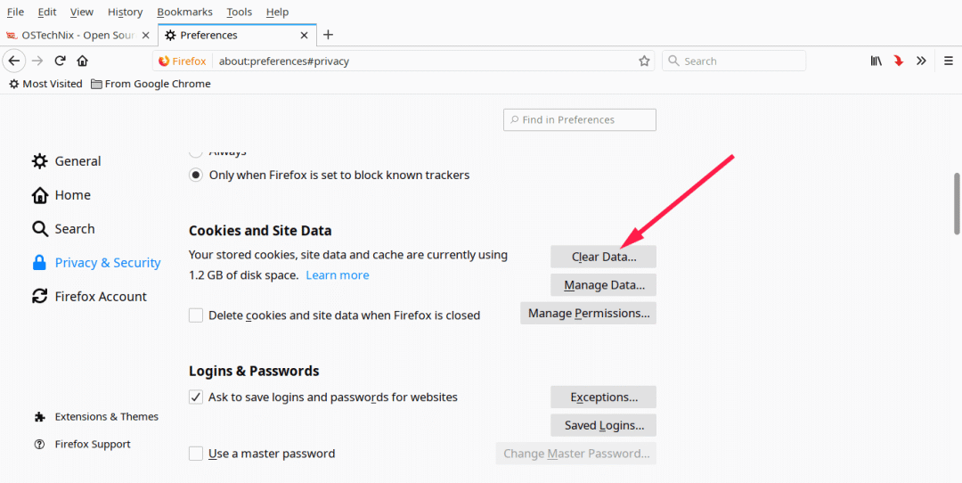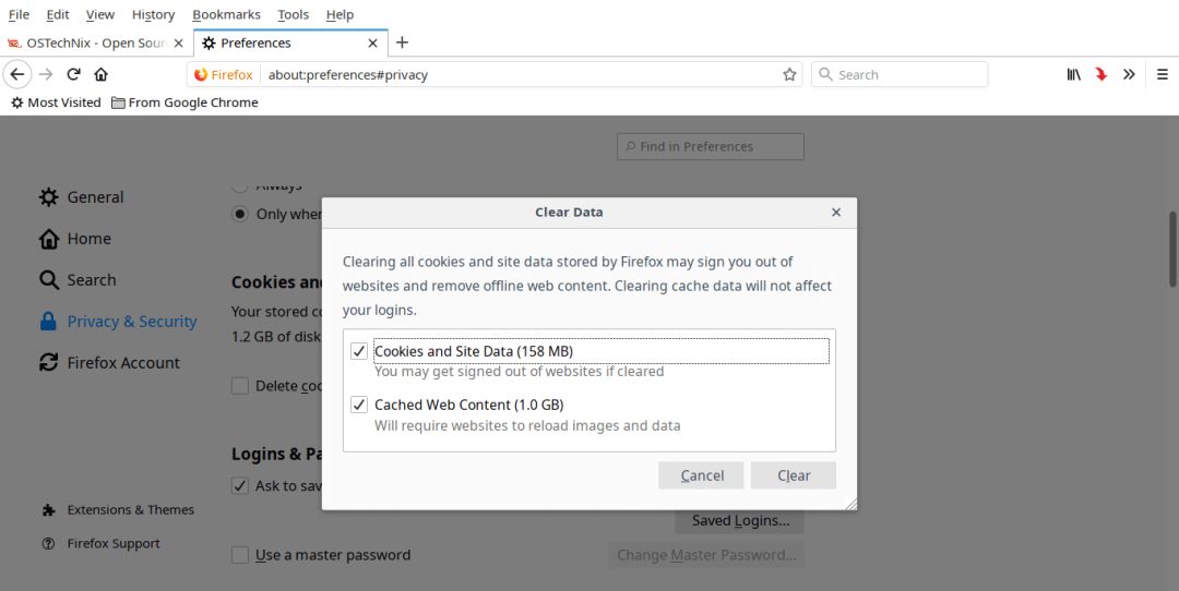 打开 “Edit - > Preferences”,在 “Preferences” 窗口中,打开左窗格中的 “Privacy & Security” 选项卡,单击 “Clear Data” 选项清除 Firefox 缓存。