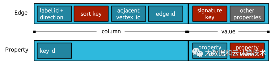 JanusGraph将邻接表按行row保存在后台存储中。使用64位的顶点Id作Key指向相应顶点的邻接表row。每个边或属性在row中都是一个独立的cell,并且这些cell可以高效的完成插入和删除。每行(row)可以存储的cell最大数在hbase做存储场景下没限制,schema free随意新增列。 后端存储hbase key全局有序保存,指向性query/range query效率很高,key是vetex id,没有前缀匹配场景。