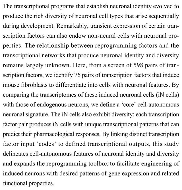 (导读 郭怿暄)神经元的转录程序使其在发育过程中产生多种神经细胞类型,一过性的表达特定转录因子还可以使非神经细胞拥有神经元特征。本研究发现76对转录因子可诱导小鼠成纤维细胞分化为具有神经元特征的细胞(iN细胞),从中定义了具有细胞自主性的核心神经元特征。iN细胞呈现出多样性和独特的转录特征。本研究为发展特定基因表达的神经元重编程提供有效手段。